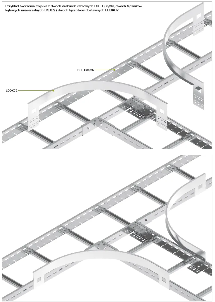 Розгалуження в будь-якому місці вже існуючого кабельного маршруту. Матеріал S - Сталь, оцинкована методом Сендзіміра PN-EN 10346:2015-09 Доступні варіанти оздоблення: F - гарячеоцинкована сталь PN-EN ISO 1461:2023-02 E - нержавіюча сталь L - фарбування у стандартний колір RAL Додаткова інформація – для кріплення пропонуємо 4 комплекти болтів SGKM6x12 або SGM6x12