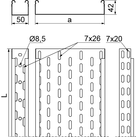 – Ø8.5 отворів в нижній частині лотків шириною 50 мм дозволяють підвішувати їх на стрижні М8