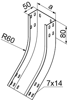 Зміна напрямку кабельної траси. Матеріал F - гарячеоцинкована сталь PN-EN ISO 1461:2023-02 Доступні варіанти оздоблення: E - нержавіюча сталь L - фарбування у стандартний колір RAL Додаткова інформація – для підключення фітинга до лотка використовуйте з'єднувач LCC... або комплект з'єднувачів LZC... та болти SGKFM6x12 або SGFM6x12