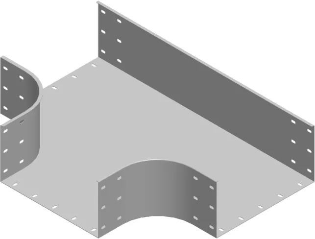Розгалуження кабельної траси. Матеріал F - гарячеоцинкована сталь PN-EN ISO 1461:2023-02 Доступні варіанти оздоблення: E - нержавіюча сталь L - фарбування у стандартний колір RAL Додаткова інформація – для підключення фітинга до лотка використовуйте з'єднувач LCC... або комплект з'єднувачів LZC... та болти SGKFM8x14 або SGFM8x14