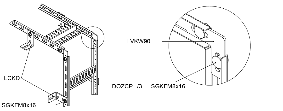 З'єднання драбин під кутом. Матеріал FP - цинкування методом цинкування ламелей PN-EN ISO 10683:2018-11 На запит: E - нержавіюча сталь
