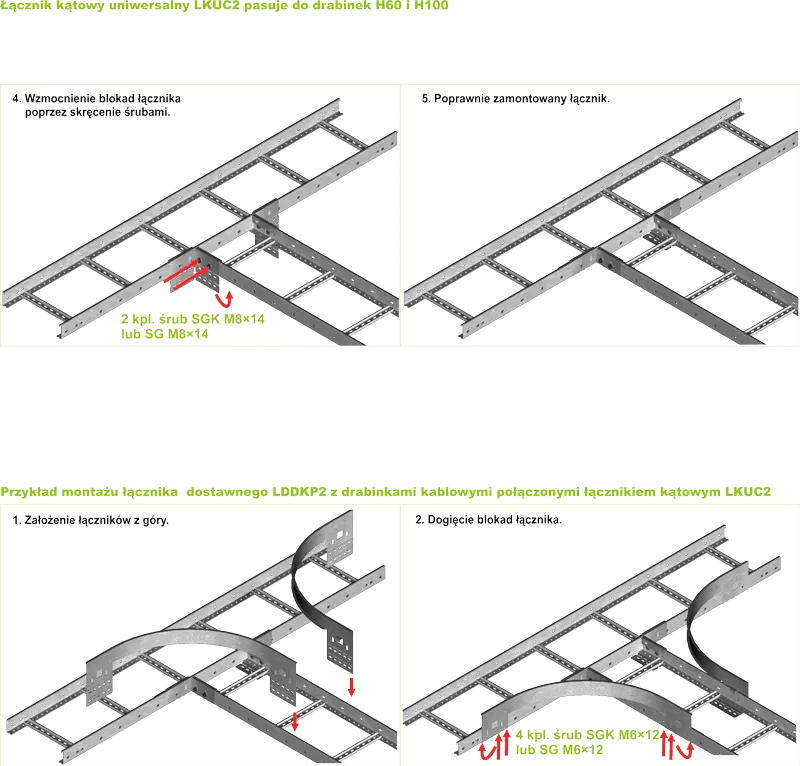 Розгалуження в будь-якому місці вже існуючого кабельного маршруту. Матеріал S - Сталь, оцинкована методом Сендзіміра PN-EN 10346:2015-09 Доступні варіанти оздоблення: F - гарячеоцинкована сталь PN-EN ISO 1461:2023-02 E - нержавіюча сталь L - фарбування у стандартний колір RAL Додаткова інформація – для кріплення пропонуємо 4 комплекти болтів SGKM6x12 або SGM6x12