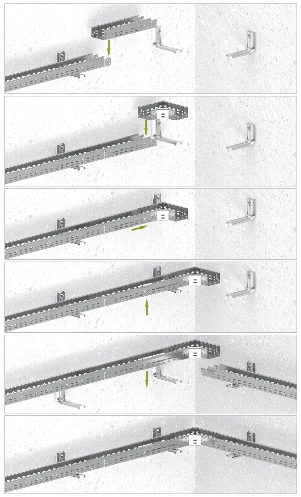 Безгвинтові з'єднання на двох кінцях кабельної траси. Можливість плавного регулювання викиду дозволяє регулювати довжину з'єднувача, позбавляючи від необхідності розрізати лоток
