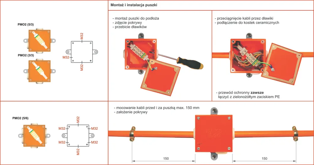 З'єднання та розгалуження кабелів і кабелів в установках із постійною функцією пожежної безпеки E30-E90. Матеріал E - нержавіюча сталь L (RAL 2004) - порошкове покриття RAL 2004 Додаткова інформація Можливе застосування кабельних вводів M32.