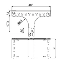 Розгалуження кабельної траси. Матеріал S - оцинкована за методом Сендзіміра сталь PN-EN 10346:2015-09 Доступні варіанти обробки: L - фарбування в стандартний колір RAL Додаткова інформація – безгвинтове кріплення ПриміткаПри монтажі потрібні додаткові з'єднувачі.
