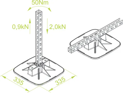 Модульна опорна система для прокладання кабельних трас, обладнання для кондиціонування повітря, труб, чилерів, доріжок, сонячних панелей, фотоелектричних панелей тощо на дахах. Монтаж на плоских дахах. Система підходить для опорних профілів 40H40 або 41H41.
