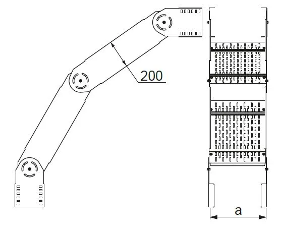 Зміна напрямку траси кабелю. Повне регулювання кута з механізмом блокування. Матеріал S - Сталь, оцинкована методом Сендзіміра PN-EN 10346:2015-09 Доступні варіанти оздоблення: F - гарячеоцинкована сталь PN-EN ISO 1461:2023-02 E - нержавіюча сталь L - фарбування у стандартний колір RAL Додаткова інформація – використовуйте болти SGKM8x16 для з'єднання фітинга з лотком