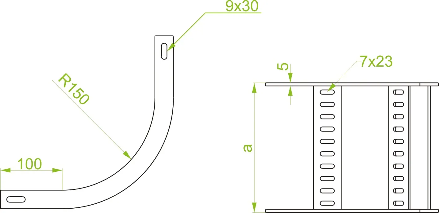 Зміна напрямку кабельної траси. Матеріал F - гарячеоцинкована сталь PN-EN ISO 1461:2023-02 Доступні варіанти оздоблення: E - нержавіюча сталь Додаткова інформація – використовуйте з'єднувачі LDOUH30 та болти SGKFM8x16 для кріплення