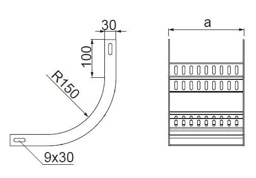 Зміна напрямку кабельної траси. Матеріал F - гарячеоцинкована сталь PN-EN ISO 1461:2023-02 Доступні варіанти оздоблення: E - нержавіюча сталь Додаткова інформація – використовуйте з'єднувачі LDOUH30 та болти SGKFM8x16 для кріплення