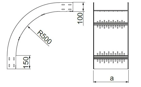 Зміна напрямку кабельної траси. Матеріал S - Сталь, оцинкована методом Сендзіміра PN-EN 10346:2015-09 Доступні варіанти оздоблення: F - гарячеоцинкована сталь PN-EN ISO 1461:2023-02 E - нержавіюча сталь L - фарбування у стандартний колір RAL Додаткова інформація – для з’єднання фітинга з лотком необхідно використовувати з’єднувачі фітингів LSSU... та болти SGKM8x16