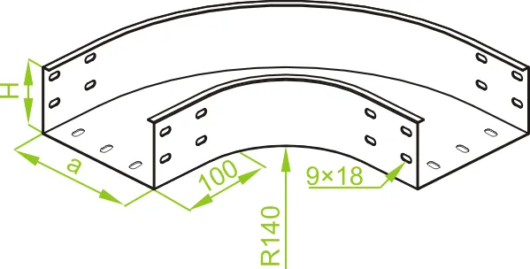 Відхилення під час прокладання кабелю. Матеріал F - гарячеоцинкована сталь PN-EN ISO 1461:2023-02 Доступні варіанти оздоблення: E - нержавіюча сталь L - фарбування у стандартний колір RAL Додаткова інформація Для з'єднання фітингів з кабельними лотками використовуйте прямі з'єднувачі LZC... та комплекти гвинтів SGKFM8x14 або SGFM8x14