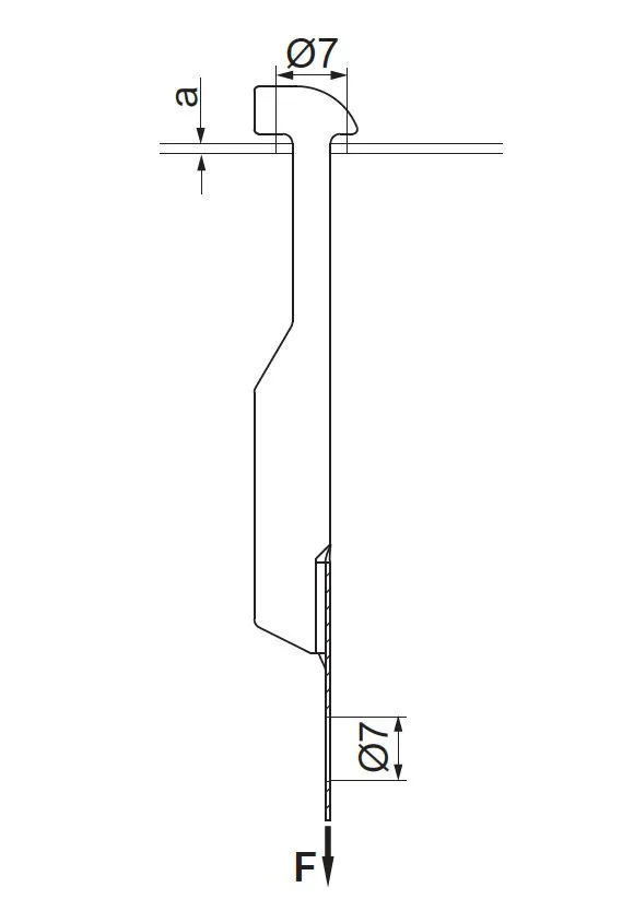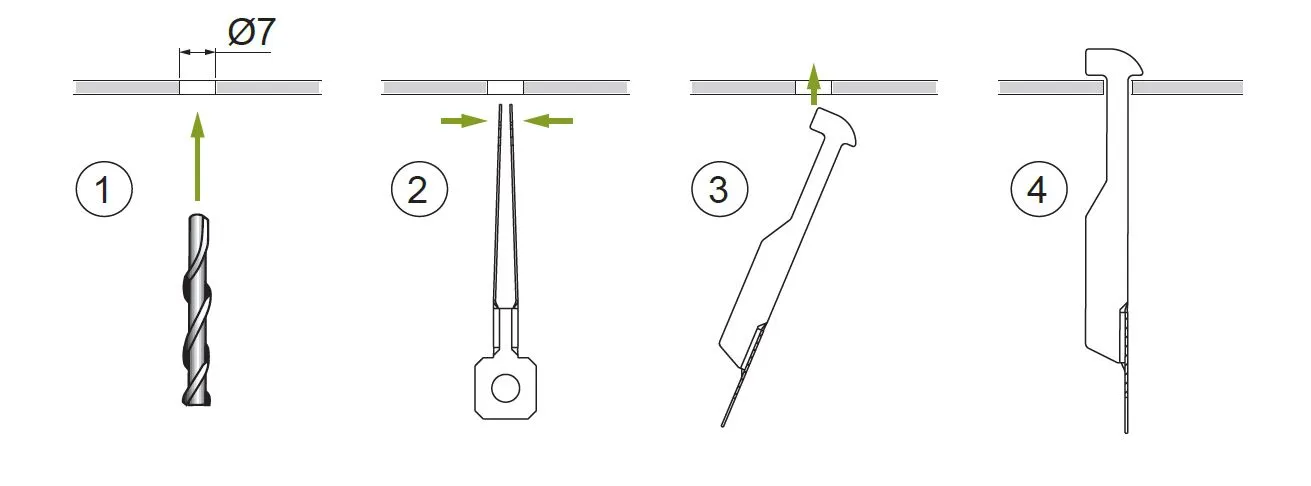 Підвішування кабелів та труб до трапецієподібних листів після просвердлення отвору Ø7. Матеріал SCS - оцинкована пружинна сталь