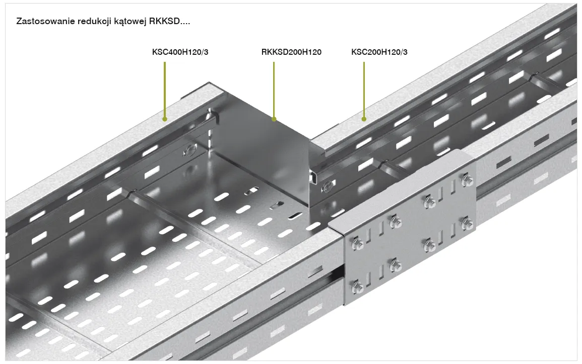 Зміна ширини кабельної траси. Матеріал S - Сталь, оцинкована методом Сендзіміра PN-EN 10346:2015-09 Доступні варіанти оздоблення: F - гарячеоцинкована сталь PN-EN ISO 1461:2023-02 E - нержавіюча сталь L - фарбування у стандартний колір RAL Додаткова інформація – використовуйте болти SGKM8x16 для кріплення до лотка або драбини
