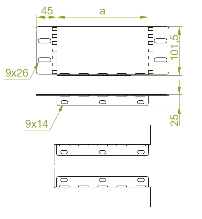 Зменшення ширини Матеріал F - гарячеоцинкована сталь PN-EN ISO 1461:2023-02 Доступні варіанти оздоблення: E - нержавіюча сталь L - фарбування у стандартний колір RAL Додаткова інформація Для монтажу використовуйте комплекти шурупів SGKFM8x14 або SGFM8x14