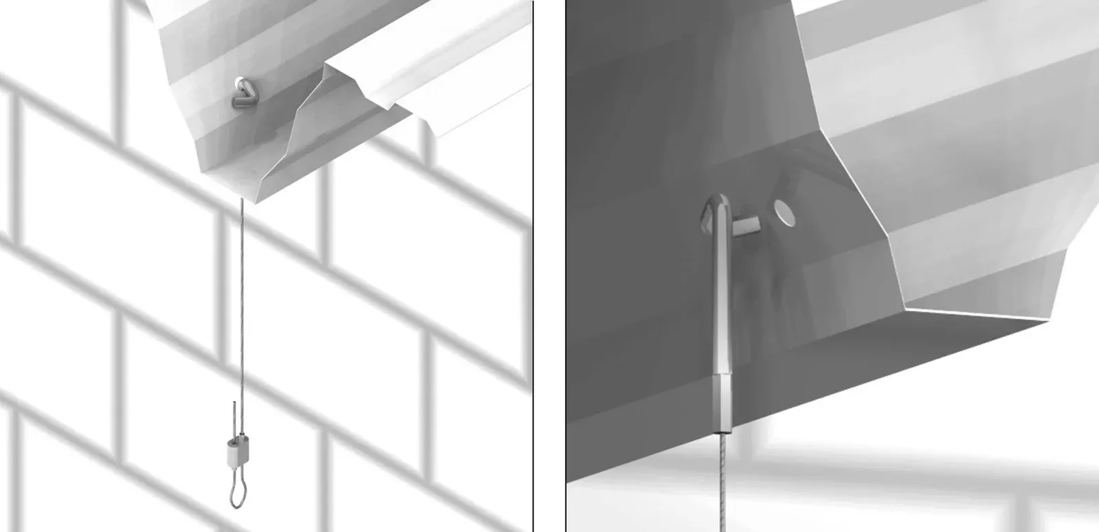 Підвішування освітлювальних приладів, кабелів, динаміків, датчиків сигналізації, вивісок, труб тощо до покрівельного покриття або трапецієподібних листів. Матеріал G - оцинкований