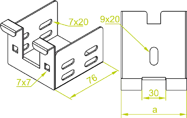 Розгалуження кабельної траси. Матеріал S - Сталь, оцинкована методом Сендзіміра PN-EN 10346:2015-09 Доступні варіанти оздоблення: F - гарячеоцинкована сталь PN-EN ISO 1461:2023-02 E - нержавіюча сталь Примітка Інтегровані з'єднувачі. Збірка без додаткових з'єднувачів.