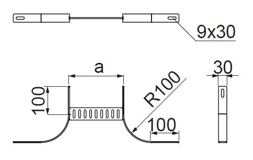 Розгалуження кабельної траси. Матеріал F - гарячеоцинкована сталь PN-EN ISO 1461:2023-02 Доступні варіанти оздоблення: E - нержавіюча сталь Додаткова інформація – використовуйте з'єднувачі LDOUH30 та болти SGKFM8x16 для кріплення