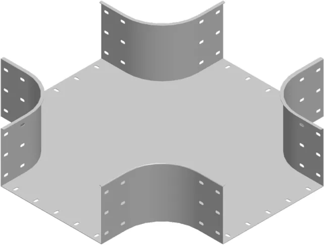 Розгалуження кабельної траси. Матеріал F - гарячеоцинкована сталь PN-EN ISO 1461:2023-02 Доступні варіанти оздоблення: E - нержавіюча сталь L - фарбування у стандартний колір RAL Додаткова інформація – для підключення фітинга до лотка використовуйте з'єднувач LCC... або комплект з'єднувачів LZC... та болти SGKFM8x14 або SGFM8x14