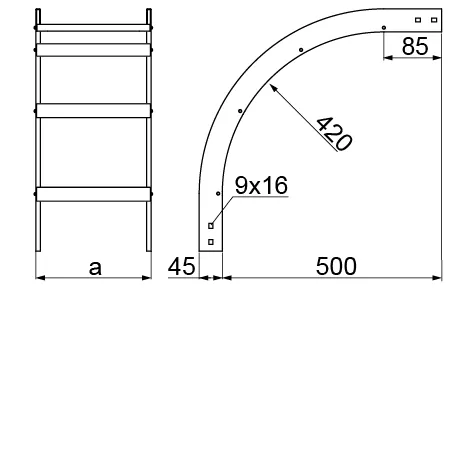 Відхилення під час прокладання кабелю. Матеріал S - Сталь, оцинкована методом Сендзіміра PN-EN 10346:2015-09 Доступні варіанти оздоблення: F - гарячеоцинкована сталь PN-EN ISO 1461:2023-02 E - нержавіюча сталь L - фарбування у стандартний колір RAL Додаткова інформація Для складання використовуйте 4 прямих з'єднувача LDCH та 16 комплектів гвинтів SGKM8x14 або SGM8x14